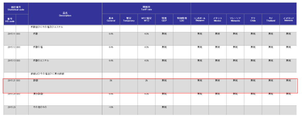 税関の最新版WEB実行関税率表(2022.01) https://www.customs.go.jp/tariff/2022_01_01/index.htm 税関の品目分類検索 https://www.customs.go.jp/searchtc/jtcsv001.jsp 税関の品目分類検索で「酢酸」を探してみます。一目瞭然!「酢酸」は検索結果の真ん中上くらいに「酢酸」という名前がありました。左を見てみると「291521000」番号が記載されています。はい、めでたくこれで作業終了。お疲れ様でした。 ちょ、ちょっと待ってください。ここで終わってしまったら、商品特定の確信を得ることはできません。 ここはもう少し検索された結果を深堀してみます。 実行関税率表はたいへん多くの事を教えてくれます。この検索結果はとても有用なヒントを示していると考えてみてください。 では検索結果をもう一度じっくりみてみましょう。
