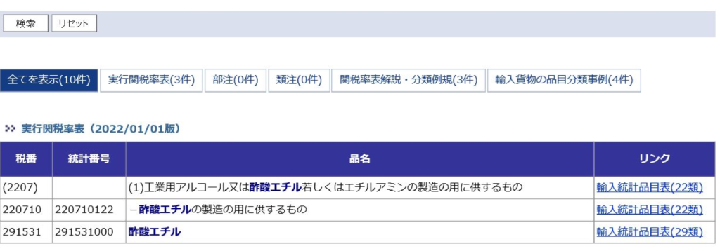 「酢酸エチル」の名前で関税率表に記載されています。別名で検索しなおさなくとも良いようです。2段下に調査済の「酢酸ブチル」がありますね。これは「酢酸ノルマル-ブチル」という名前で登録されておりました。この別名が税番確定の決め手になりました。