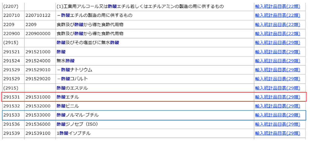 「酢酸ブチル」の場合、別名から税番を確定し関税額、消費税を計算してみました。実はその他の分類の方法を言いたくて、同じ29類の中から「酢酸エチル」を選んでみました。両者はもちろん税番は同じではありません。さてどこで区別をしているのでしょうか。
