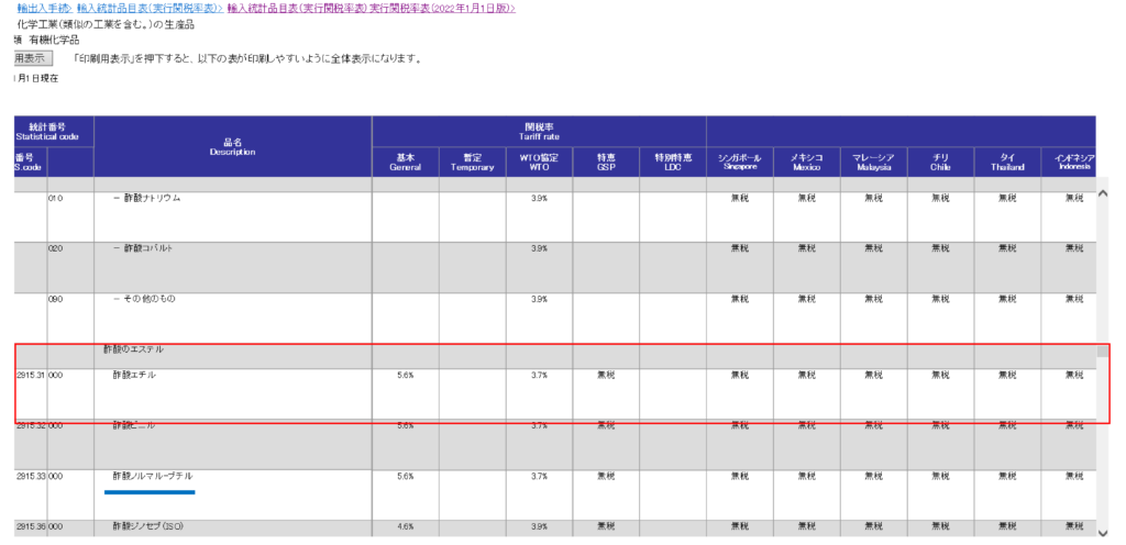ではさっそく税関WEB実行関税率表(タリフ)を使って「酢酸エチル」の号までの、6桁数字を特定していきましょう