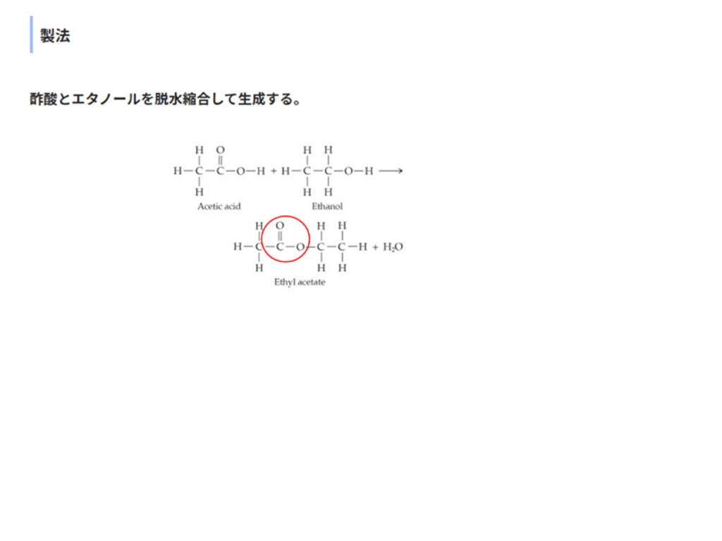 そしてこの赤丸部分の構造がエステル結合といいます。この構造を持っている物質の仲間なのですね。それで関税率表に酢酸エステルと記載があったのか、と納得できます。