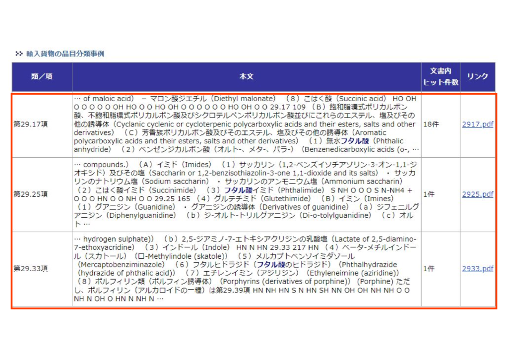 関税率表解説、分類例規も輸入貨物の品目分類事例も29類のヒット件数が一番多いのがわかります。