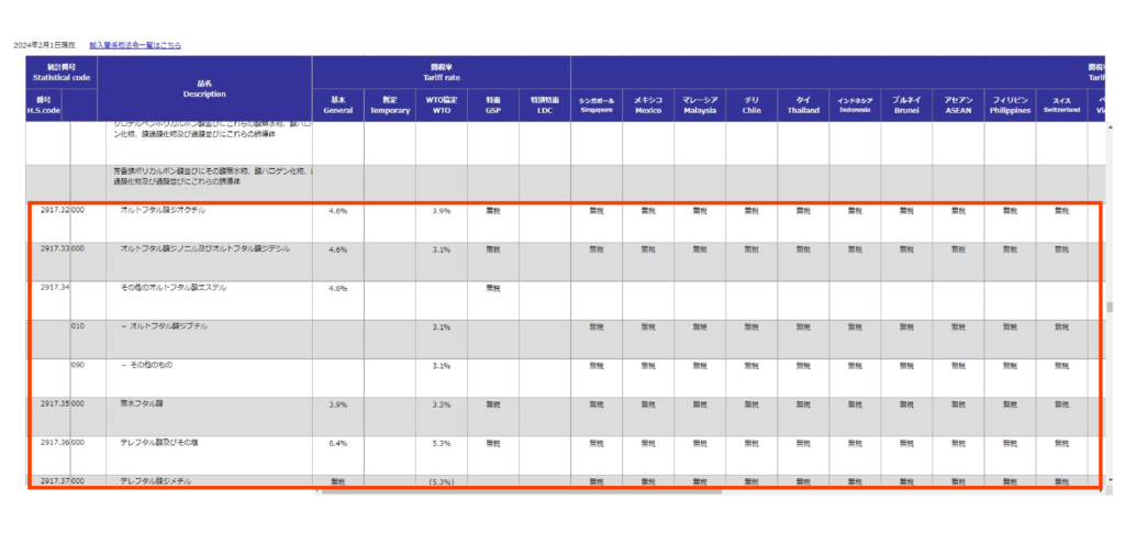 通関士としてやることは、税番と税率を確定させること。品名と別名をたよりに実行関税率表の2917項を更に細かく調べてみます。