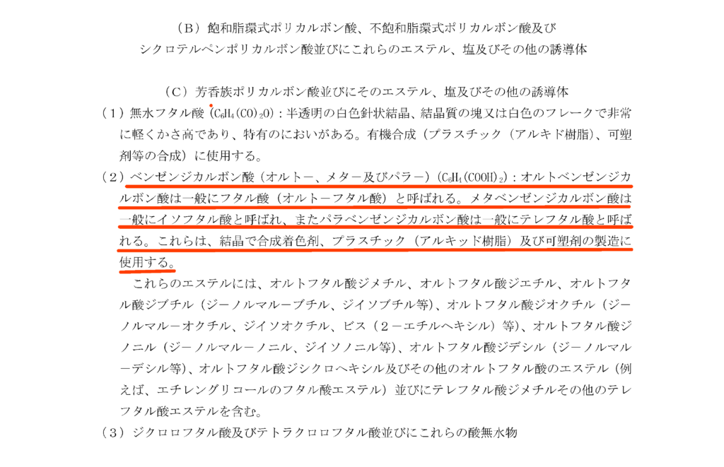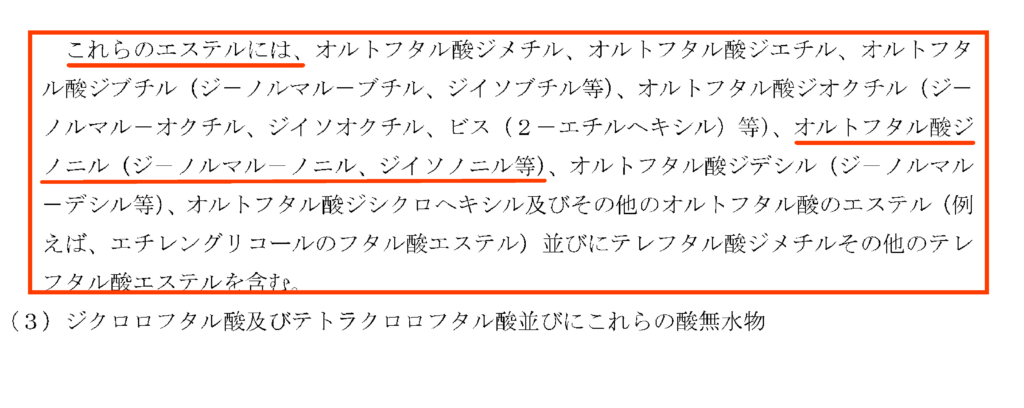 たしかにフタル酸という名前がでてきていますが、「無水フタル酸」「オルトフタル酸」「テレフタル酸」などの記載があります。はたしてどの項に目的のフタル酸ジイソニルが分類されるのでしょうか?
