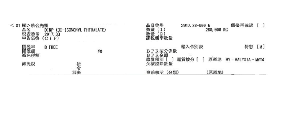(荷主用の輸入許可通知書は守秘義務がありますので、税番記載部分だけ切り取っています。商品名はDINPと通称名の記載がありますが、フタル酸ジイソニルです。)
