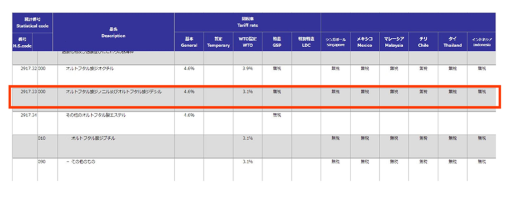 「2917.33.000」が記載してある箇所には、関税率とあり基本、暫定、協定、特恵、特別特恵と記載のある項目に数字がかかれていますね。これが関税の適用税率です。横の商品名とそれぞれの項目が交差する部分に記載されている数字が関税率です。(%表記ということは従価税率ですね)